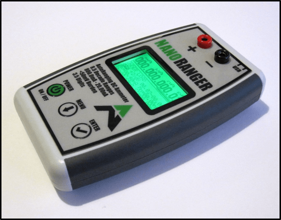 NanoRanger® is an accurate, 3.5 Digit, affordable, DC ammeter to measure very low currents. With automatic dynamic ranging (9 ranges across 8.5 decades), NanoRanger® measures from 800mA to 1nA, whilst offering a maximum resolution of 10pA. Because each NanoRanger® is factory computer calibrated, we can limit the requirement for high-cost precision components, thus keeping the price to you low. You can download the full Instruction Manual and Quick Start Guide below. Also, check out some NanoRanger® Applications here.